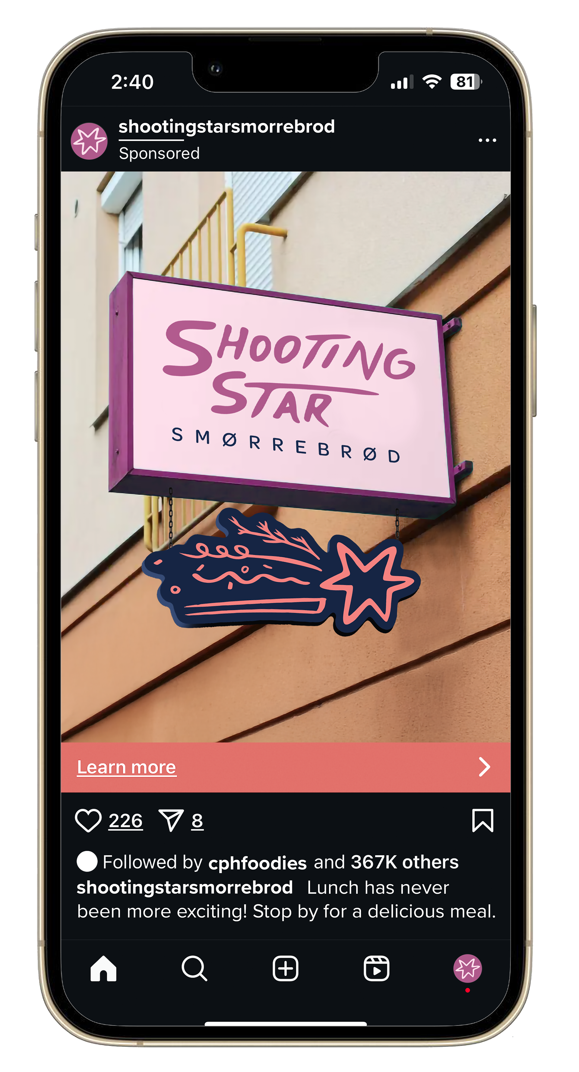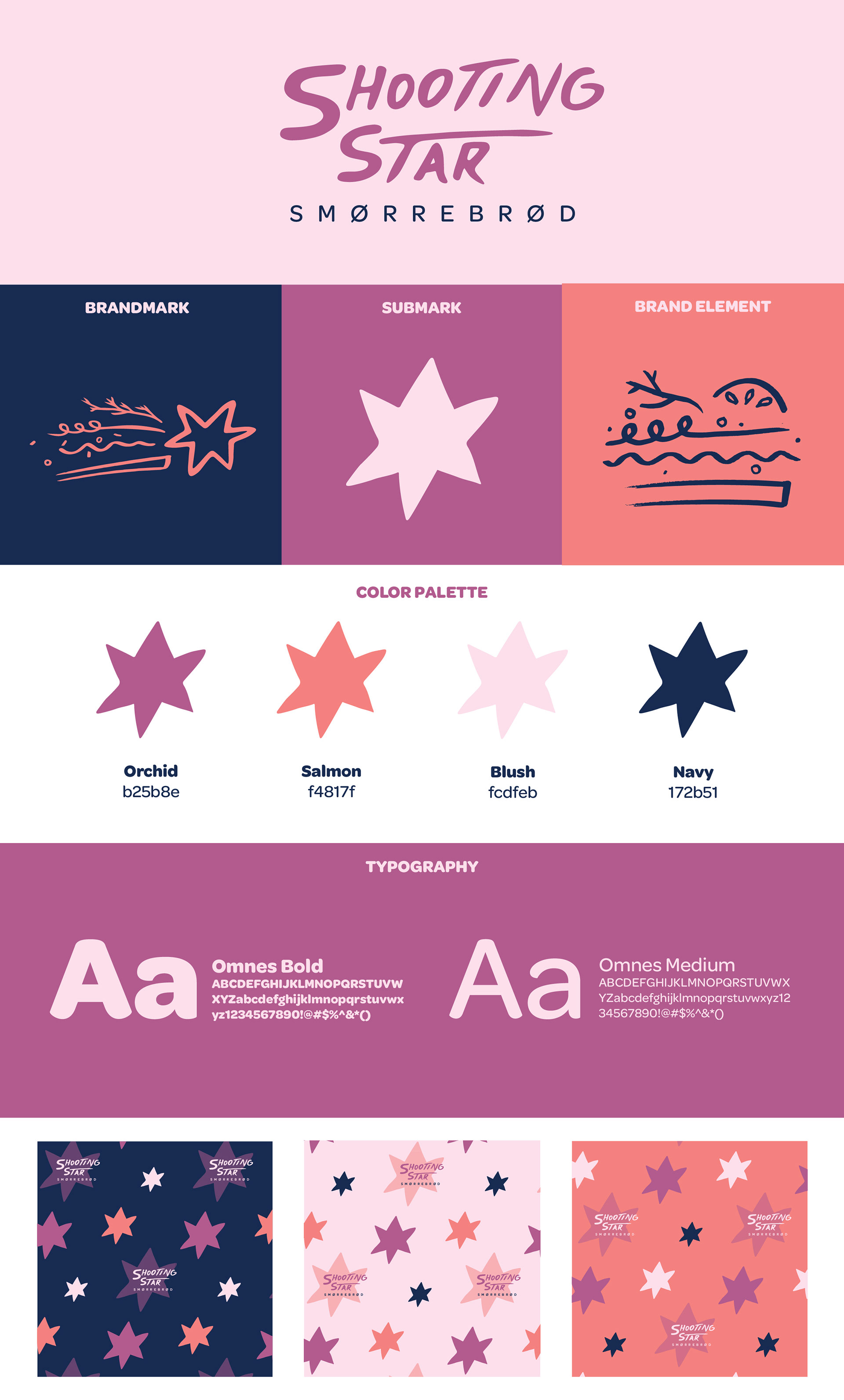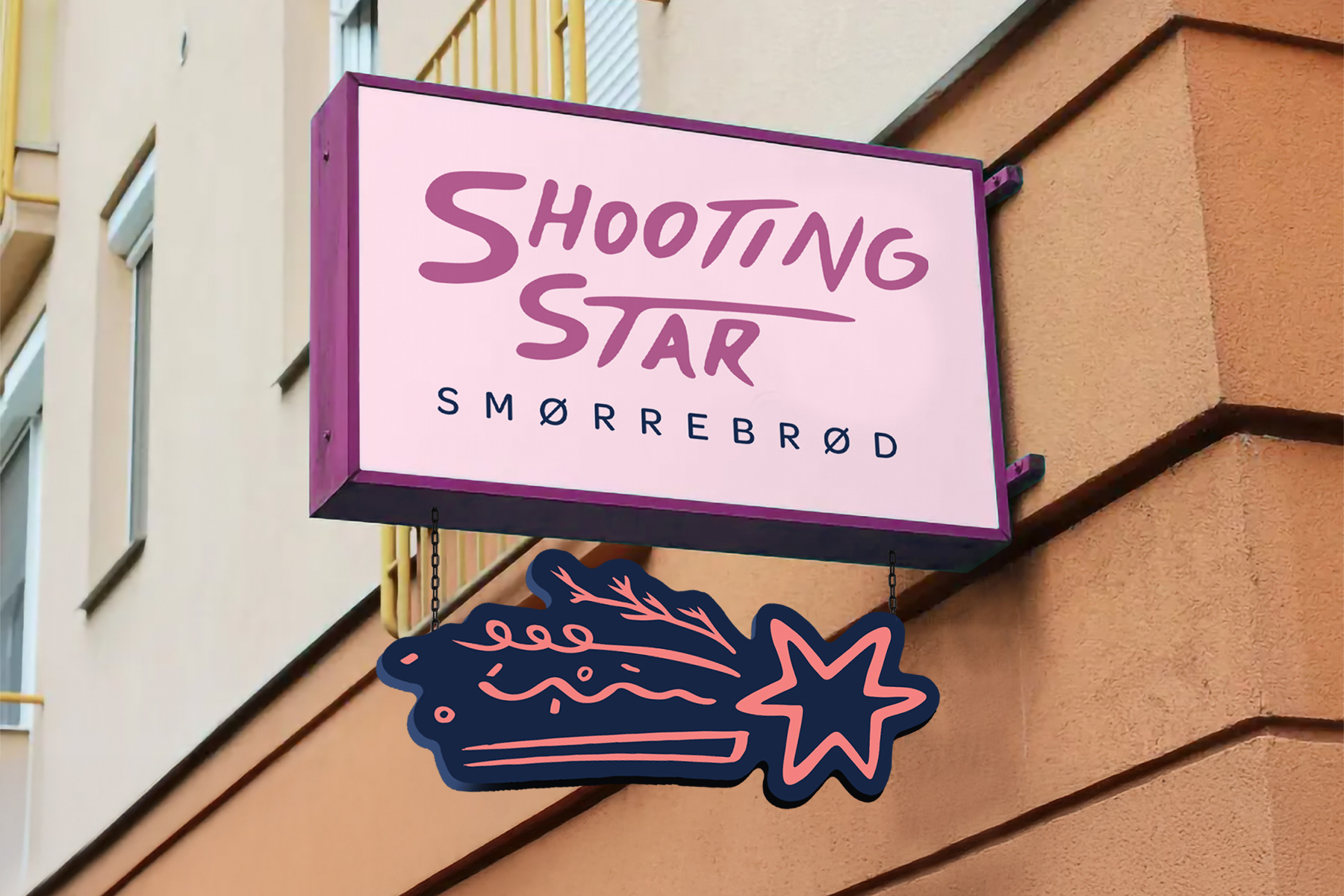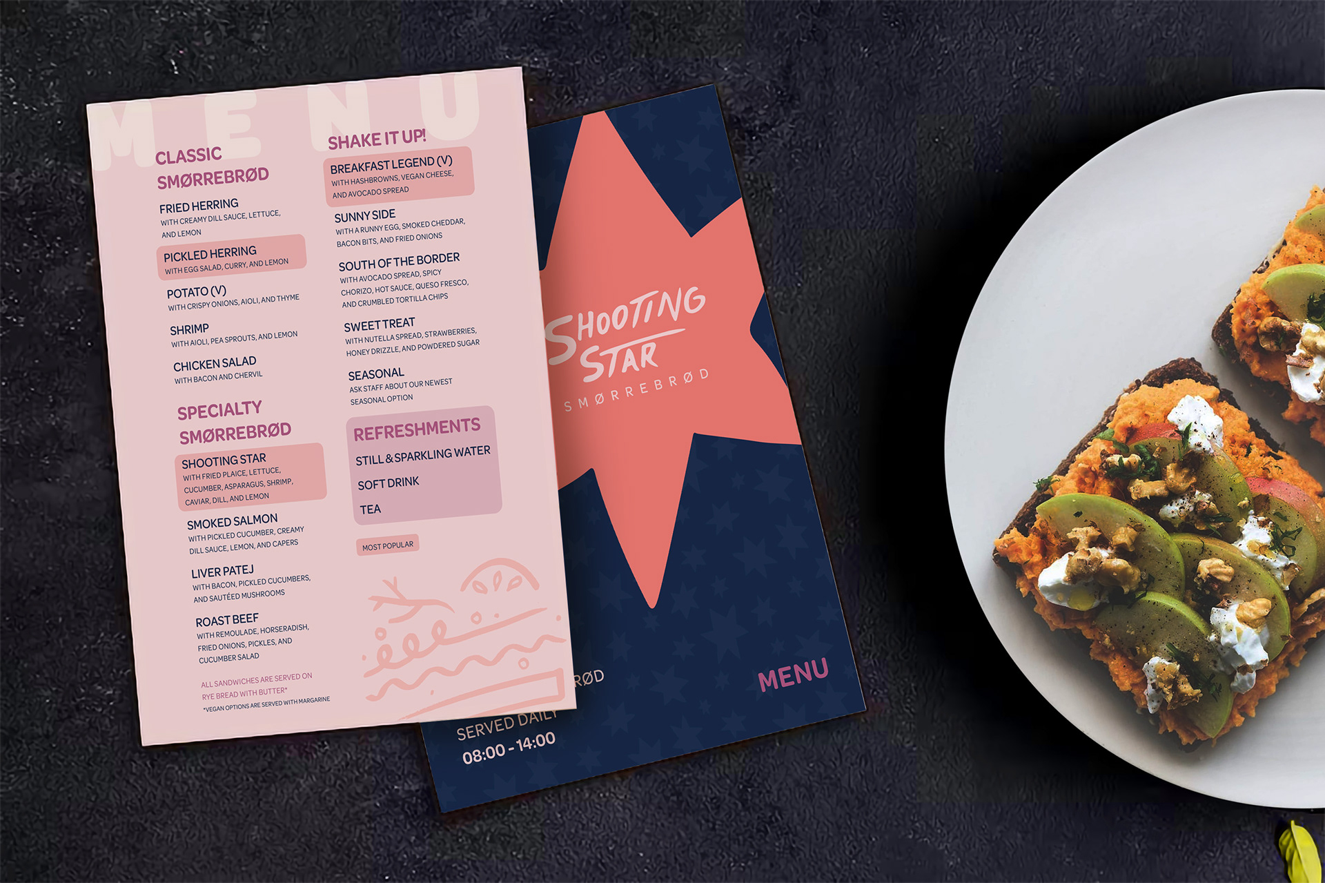 With Denmark's popular national dish smørrebrød as the star of the show, I developed a restaurant identity named Shooting Star Smørrebrød. The name derives from a variety of the open-faced sandwich called "stjerneskud" which means shooting star in Danish. The six-pointed star in the brandmark is inspired by the Copenhagen City emblem and is closely followed by the delicious elements of the smørrebrød sandwich. The identity is geared towards both the young and busy developing workforce in Copenhagen, and the bustling tourist scene, who are interested in a fast and easy traditional Danish meal.